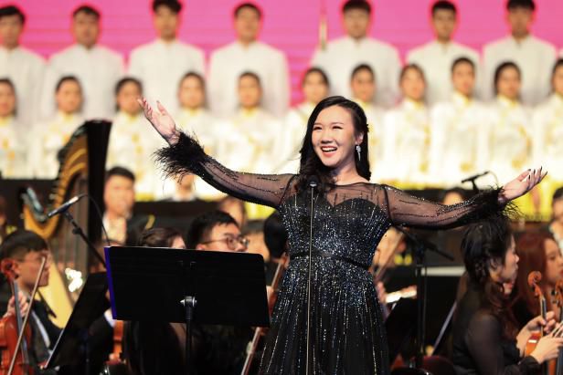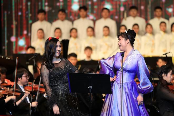 音乐会在恢弘澎湃的《第一交响序曲》中拉开帷幕,丰富的配器和声、波澜起伏的节奏,描绘出一幅革命先辈们前赴后继、波澜壮阔的历史画卷。由李鸿独唱的歌曲《为艺术,为爱情》感情强烈而深厚,《晴朗的一天》旋律舒缓而甜美。《小嘴巴》《我的太阳》等歌曲在戴玉强的演绎下,让现场观众在感动中沉浸于美妙的歌声里。戴梓伊演唱的歌剧《西西里晚祷》选段《多谢好朋友》,激情富有节奏感的演唱,赢得观众的阵阵掌声。《喀秋莎》《红莓花儿开》《卡林卡》等民歌名曲联唱将音乐会推向高潮。当《我和我的祖国》旋律响起,全场观众起立与台上演员一同歌唱,音乐会圆满落下帷幕。
