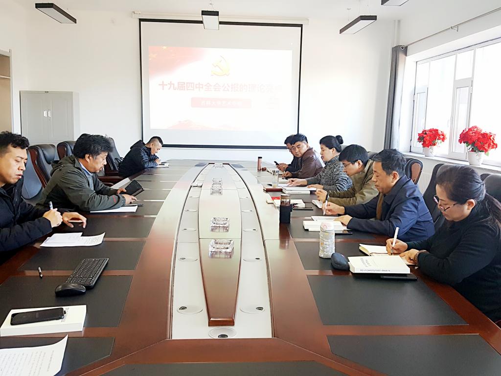 本次学习会,黄蕾书记领学了十九届四中全会对中国特色社会主义制度和国家治理体系作出的一系列新的重要论述。中国共产党第十九届中央委员会第四次全体会议于2019年10月28日至31日在北京召开,全会听取和讨论了习近平受中央政治局委托作的工作报告,审议通过了《中共中央关于坚持和完善中国特色社会主义制度、推进国家治理体系和治理能力现代化若干重大问题的决定》。黄书记从“一个定位”、三个“是”、“十三个显著优势”、“总体目标”、十三个“坚持与完善”、“重大战略任务”等六个方面对党的十九届四中全会公报体现的理论亮点进行了详细解读。与会人员围绕十九届四中全会公报内容,结合分管工作谈了学习体会和感想。