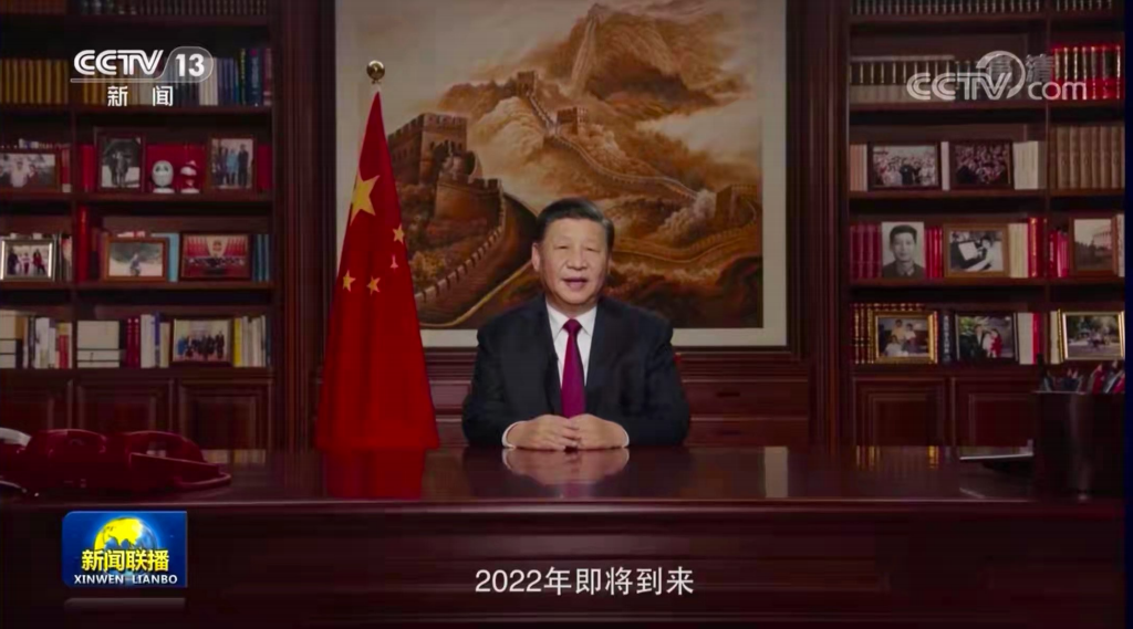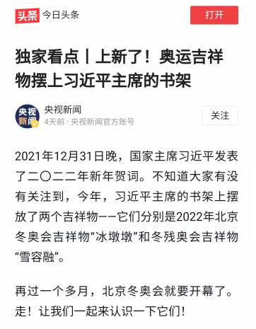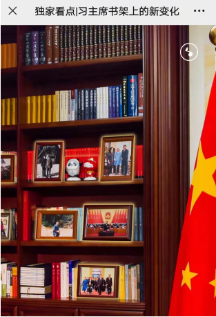 今年,习近平主席的书架上摆放了两个吉祥物——他们分别是2022年北京冬奥会吉祥物“冰墩墩”和冬残奥会吉祥物“雪容融”。[14]