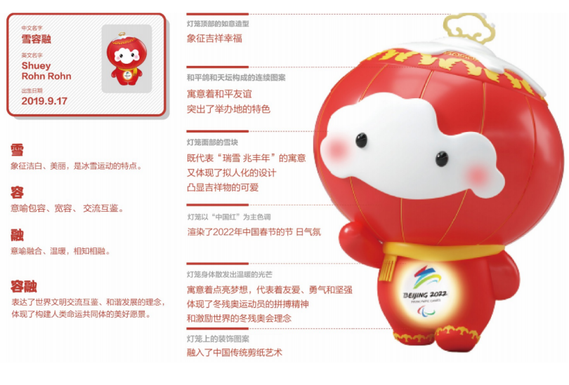 冬残奥会吉祥物“雪容融”(Shuey Rhon Rhon),其名称由来:在团队给作品起名时,考虑到与冬奥会吉祥物“冰墩墩”对仗,采用了“雪”字对“冰”字,有“瑞雪兆丰年”之意,而灯笼给人暖融融的感觉,为了体现包容和交流,采用了“容”和“融”字。[3]其中,“雪”,象征洁白、美丽,是冰雪运动的特点;“容”,意喻包容、宽容、交流互鉴;“融”,意喻融合、温暖,相知相融。“容融”,表达了世界文明交流互鉴、和谐发展的理念,体现了通过残奥运动创造一个更加包容的世界和构建人类命运共同体的美好愿景。[4]