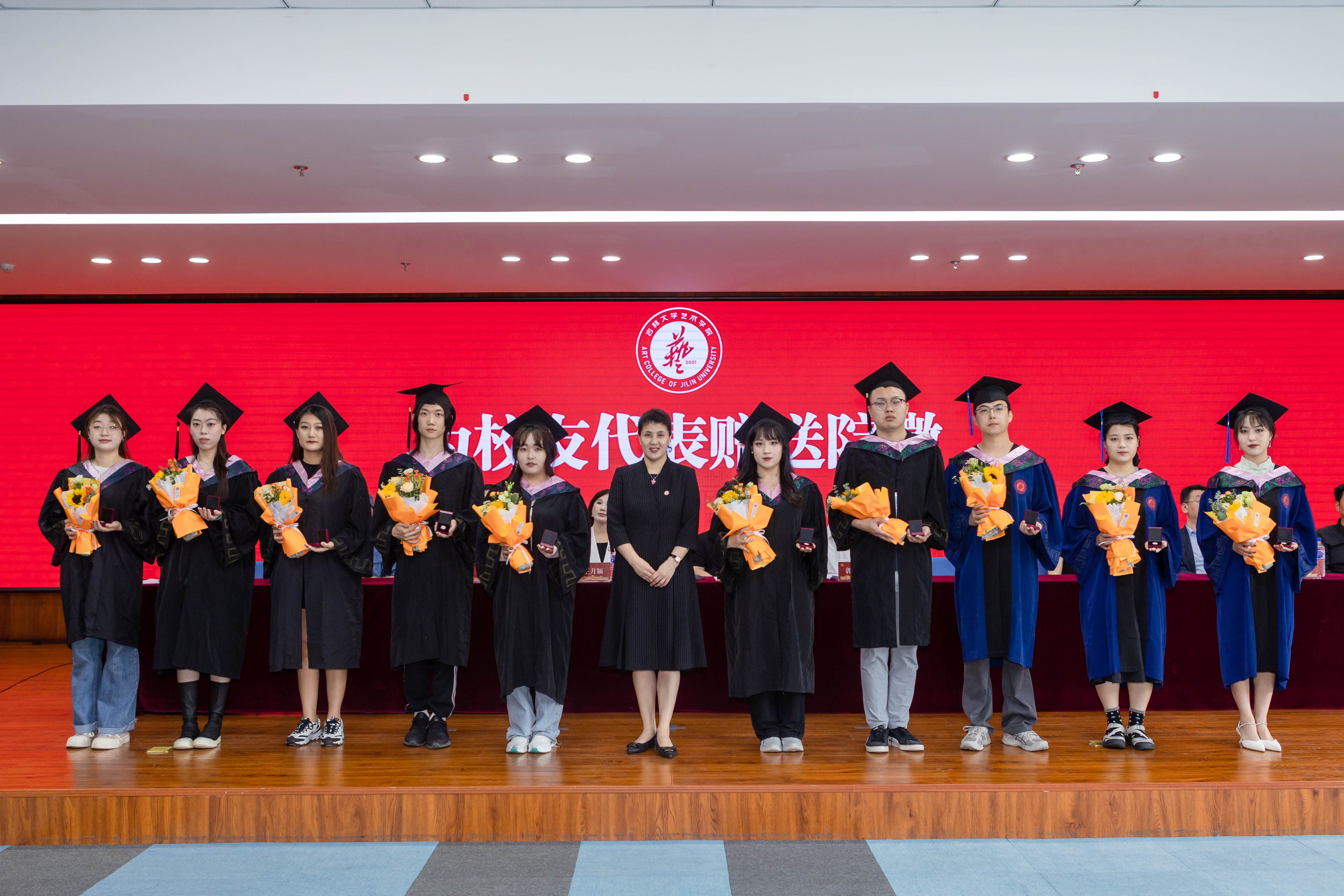 典礼上,学院实现了去年的承诺,邀请到了2020、2021、2022届校友代表与23届毕业生一起参加毕业典礼和学位授予仪式,主持人对他们依次做了介绍,党委书记黄蕾为他们赠送院徽、鲜花并合影留念。全体毕业生也收到了来自母校及学院的“毕业礼物”:印有91九色