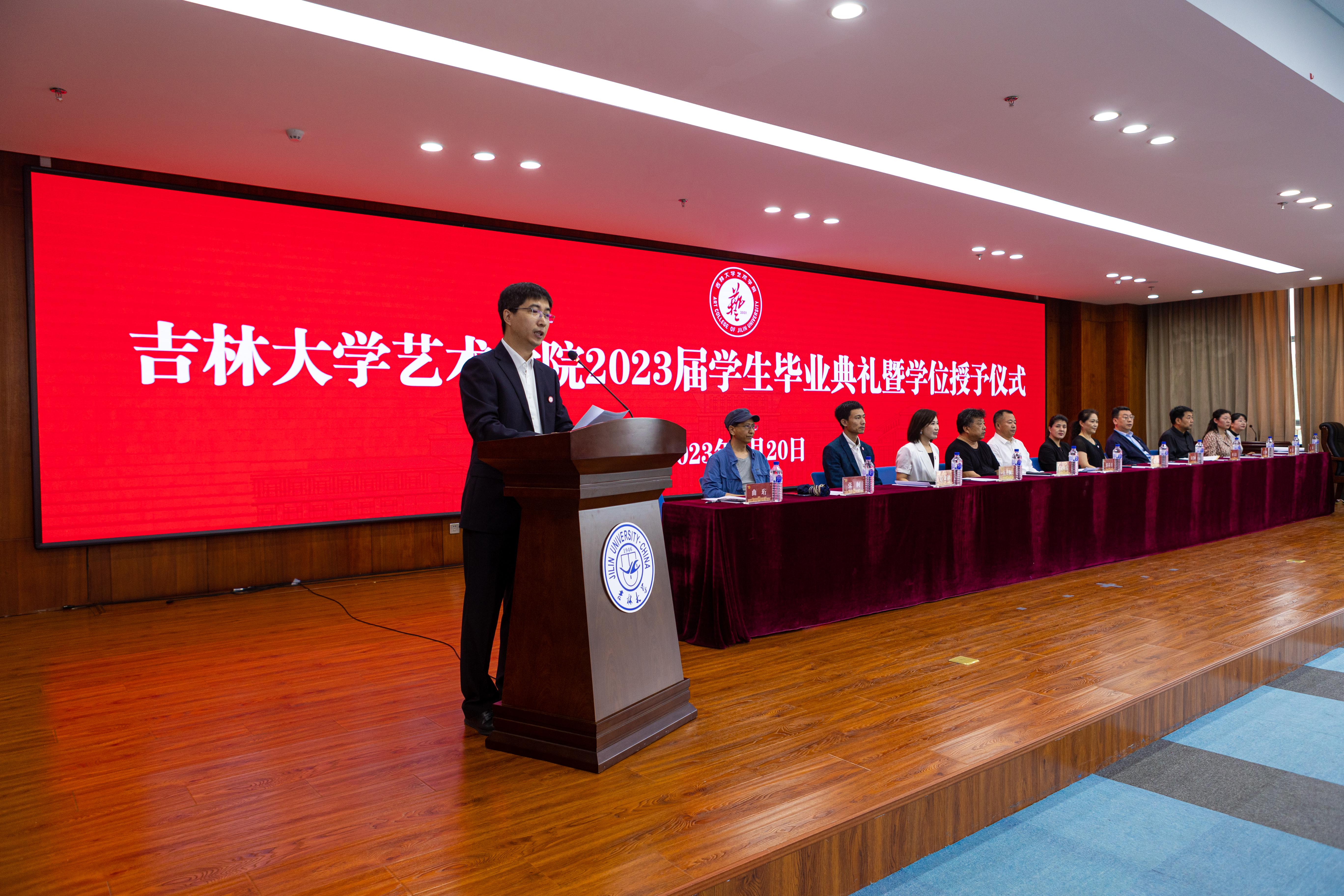 在热烈的掌声中,郭春方院长致辞。他代表学院向全体毕业生致以最诚挚的祝贺和最美好的祝愿,并以《美的执着》为题与同学们分享了行走在艺术之路的所思所感。他指出,讲好故事,是文艺创作的使命担当。回顾过往,优秀的文艺作品往往离不开对中华优秀传统文化思想观念的阐述,离不开对于中国艺术精神的诠释,离不开对于民族历史、灿烂文明的回溯与解读。从重点文化类创新节目《典籍里的中国》,到“人间奇迹”的话剧《红旗渠》,以及2023年新课标Ⅰ卷作文考题“故事是有力量的”,这些都积极引领莘莘学子将目光聚焦于故事的魅力与魄力。希望同学们将目光聚焦于大气磅礴的民族故事,创作出更多具有家国情怀、体现民生情怀、能够完成宏大叙事的艺术作品,才能令世界看到、听到、感受到更加生动、真实的中国。他指出,美的执着,是文艺创作的坚韧灵魂。学院精心打造的“萃文讲堂”十六讲,从音乐指导到美术创作,从人才培养到学科建设,邀请海内外名师名家,为同学们启迪学术思维,拓宽科研视野,领略文艺创作的多种可能性。希望同学们以新一代艺术工作者的青春灵动与蓬勃朝气,感悟时代脉搏,弘扬社会风尚;扎根脚下沃土,用艺术语言感悟历史精髓,以美的方式阐释时代精华,将中华美学精神和21世纪的审美追求融会贯通,抒写新时代中华文化的华彩篇章。他指出,匠作精神,是艺术理想的不懈追求。大型纪录片《百年巨匠》立体再现一代艺术大师真实生动、极富传奇色彩的人生历程;纪录片《李苦禅》对其不朽的精神风骨与崇高的艺术境界再做解读,这些是新时代文艺创作所需要的匠作精神。人比山高,路比脚长,历时2个多月的排演,在鼎新大讲堂上演的全国首部以凝练知识分子“北上精神”为主旨的大型舞台话剧《先生向北》,讲述先贤故事,刻画校史经纬,深深震撼着每一名吉大人的心灵。91九色