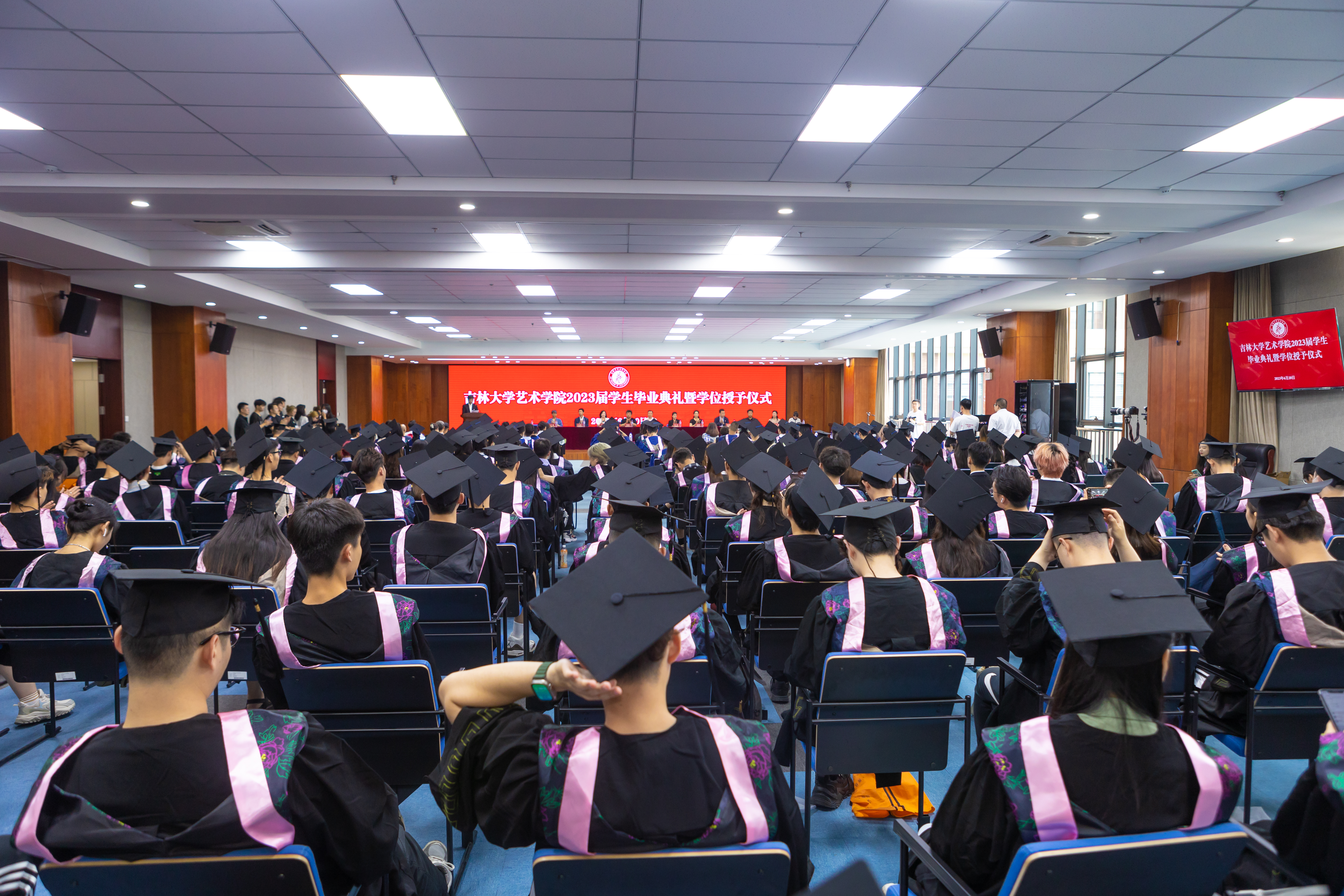 设计系、美术系、音乐系近30位导师作为主礼教授见证毕业生授予学位。仪式最后,主礼教授全体起立,一同祝福毕业生们毕业快乐,并深情寄语,希望同学们始终高扬理想信念旗帜,向下扎根,向上生长,以“求实创新,励志图强”的实际行动践行初心使命,在新时代的奋斗中释放青春激情、追逐青春理想,脚踏实地、苦练本领,用自己的双手创造属于自己的精彩人生。与会师生共同高喊“一日归属吉大,一生念念不忘”表达对老师的感恩,对母校的眷恋和对未来的信心。