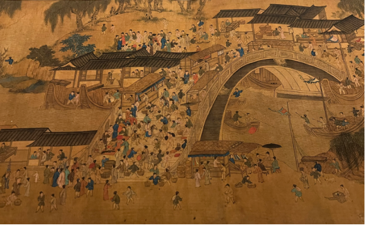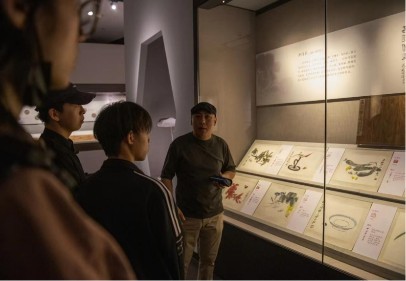 期间,同学们观赏了从元代至近现代的各类馆藏书画精品,如齐白石、张宗苍、董其昌等大师的艺术作品,涵盖了人物画、山水画、花鸟画及风俗画等多个门类。尤其是通过多媒体和全息影像技术展示的清代徐扬作品《姑苏繁华图》,以其动态的视觉呈现和环绕音效,为学生们提供了一个沉浸式的体验,极大地拓展了同学们对传统绘画艺术表现形式的理解,得以全方位沉浸式体验中国传统书画的独特魅力和深厚文化内涵,感受中国画诗、书、画、印交融和合的意境。