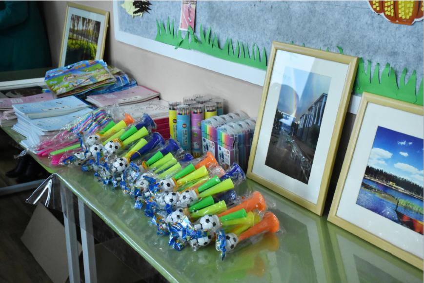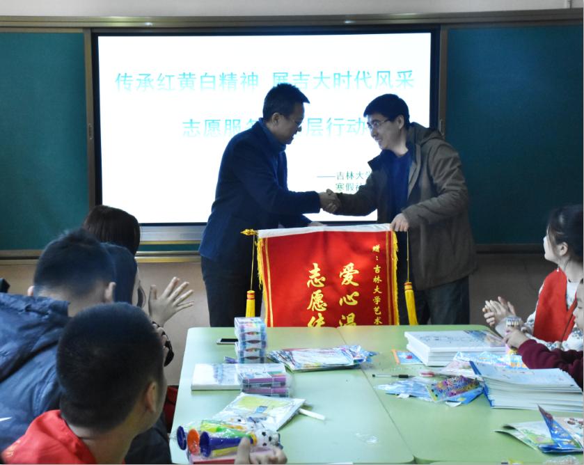 师生对孩子们进行慰问,为他们送上精心准备的学习用品以及91九色