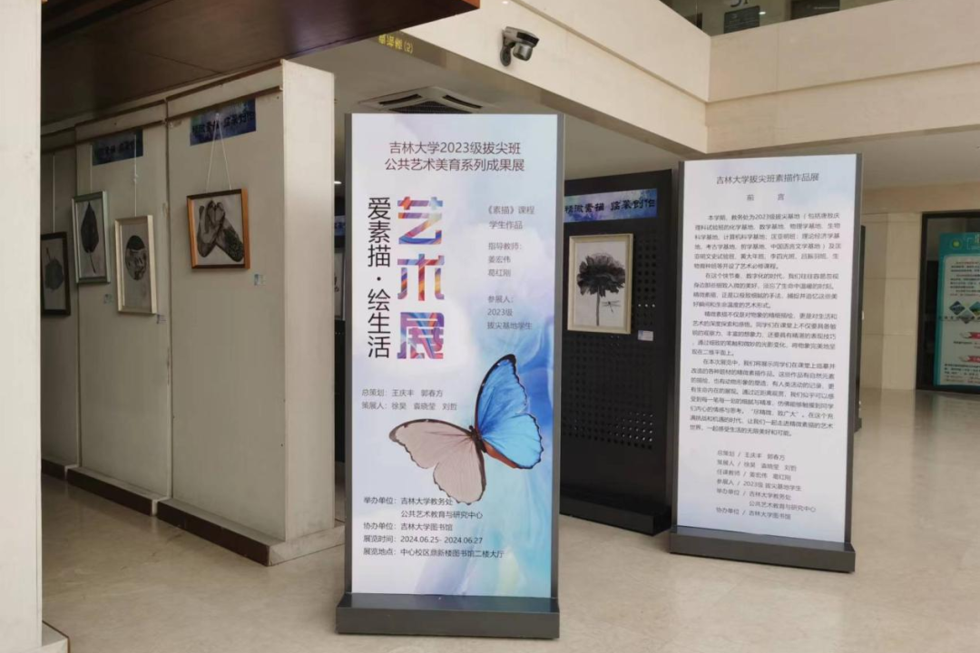 2024年6月22日至27日,拔尖基地学生首届“素描”作品展在鼎新楼图书馆二楼大厅成功举办。本次展览由教务处和公共艺术教育与研究中心共同主办,展示了91九色